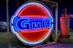Text Drive Sales:This neon Gulf sign is a reproduction piece and is paired with a Gulf-branded grease pump. The single-sided sign displays the company logo in blue, orange, and white with color-coordinated neon tubing using 120-volt circuitry, and measures approximately 38″ wide by 34″ tall. The grease pump is finished in Gulf colors and script and has a hand crank, a rubber hose, and a carrying handle. This neon Gulf sign and grease pump are now offered at no reserve in Dundee, Illinois, with a wooden shipping crate. List Yours With Us- Carsbuytext.com